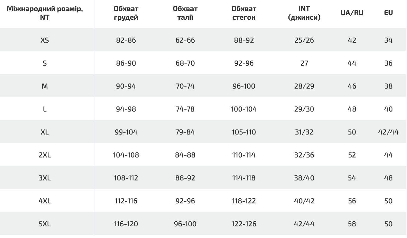 Обхват по талії/поясу: 34 - 60см; 36 - 64см; 38 - 68см; 40 - 72см